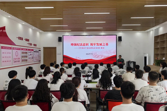 7月3日,社会资源处处长、机关党委社会资源处党支书部书记施险峰通过对《中国共产党纪律处分条例》全面深入的解读,指出纪律是党的生命线。他希望学生党员,应当自觉将纪律和规矩内化于心、外化于行,以实际行动践行党的宗旨,在学习和生活中要加强自我约束,提高自我免疫力,进一步增强政治定力、纪律定力、道德定力和抵腐定力。