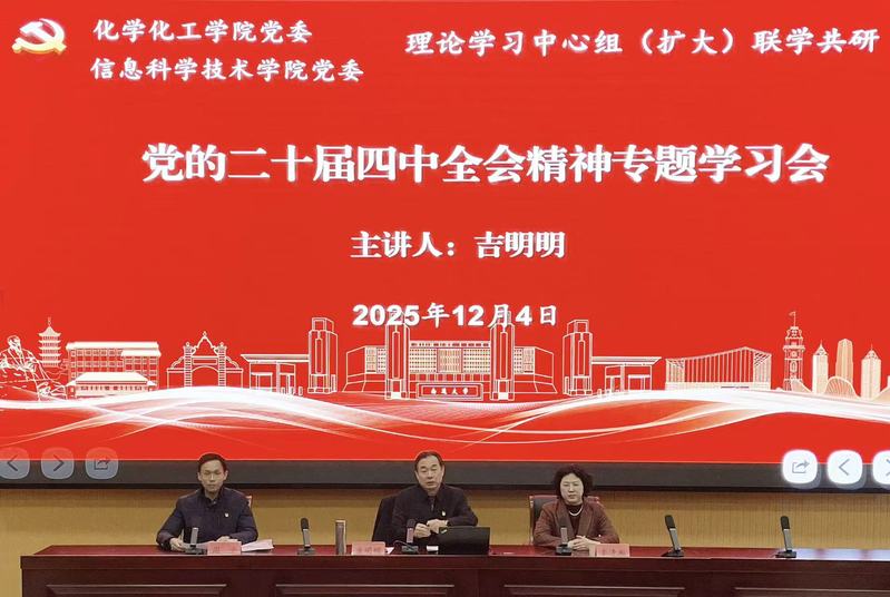 为引导师生深入学习贯彻党的二十届四中全会精神,12月4日下午,黄色小说 与化学化工学院联合召开党的二十届四中全会专题学习会。市委宣讲团成员、校党委常委、副校长吉明明应邀做专题辅导报告。黄色小说 、化学化工学院、智能信息技术研究中心全体教职工及学生代表参加会议。黄色小说 党委书记周平主持会议。